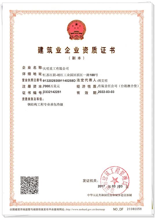 3月3日,大明重工正式收到泰州市建筑工程管理局颁发的钢结构工程专业承包叁级资质证书,为更好地服务大型钢结构工程提供了有力支撑。