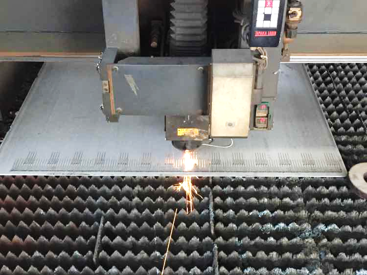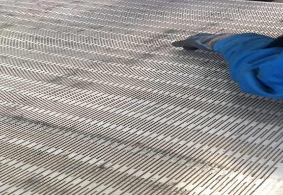 针对该新产品,天津大明决定使用田中6KW激光设备进行加工,首先通过不断调整切割机及割枪配件等,确定了合适的加工参数。该筛孔型塔板需要在5mm厚的不锈钢板上切割出0.5(±01)mm的细长割缝,这种整板的割缝加工在切割过程中易发生变形移位,天津大明采用固定板材的工艺对原材料进行固定夹装,解决了问题。对于切割后产品反面产生的硬毛刺,常规的打磨会使打磨后的残渣落入狭窄的割缝中,影响产品的最终使用,如采取喷砂虽然能解决该问题,但会增加客户成本。天津大明经过研究,最后采用自制刀具对打磨后的割缝进行刮渣处理,解决了隐患,节约了客户后期的加工成本。