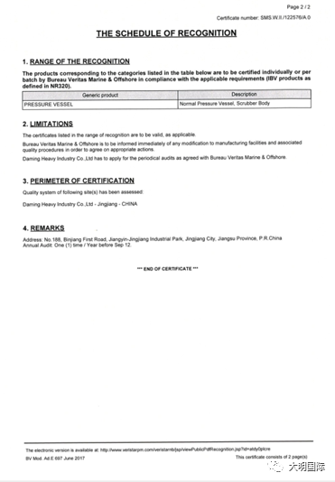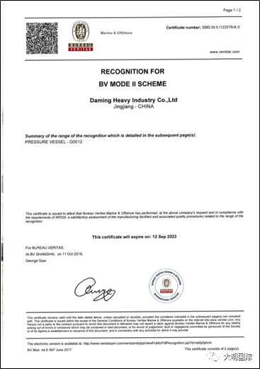 经过审核专家对大明重工的压力容器制造过程以及相关程序进行严格的审核,2019年11月2日,大明重工根据NR320标准的要求取得了BV船级社签发的压力容器工厂认可证书(常压、洗涤塔)。该资质的取得进一步丰富了大明重工的产品体系和范围,大明重工将能够生产制造海上常用类船用压力容器产品,进一步提高了竞争力和行业地位,为拓展业务打下坚实的基础,对企业未来的生产经营也将产生积极影响。