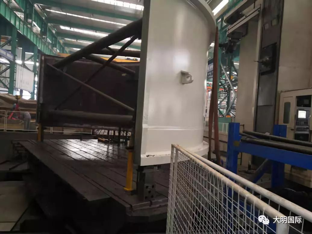 此种分瓣式磨机在国内尚属首次加工,该筒体加工要求两端连接法兰垂直度0.05mm、跳动公差0.05mm、表面粗糙度3.2,两端及筒身周边小孔均需一次加工成型。大明重工使用280落地镗进行加工两瓣结合面,然后用22米立车对该件整体车削、钻孔以保证产品的完成。
