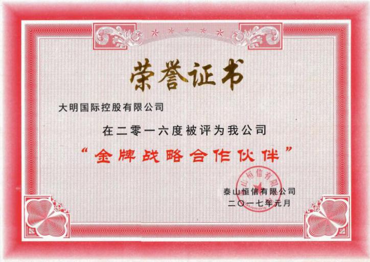大明从客户的需求出发,依托齐全的钢种资源、先进的加工设备、成熟的“一站式”服务模式,受到了泰山恒信有限公司的青睐。在2017年初,泰山恒信有限公司向大明国际颁发了“金牌战略合作伙伴”的证书,以表示对大明高精度产品和及时、周到服务的认可。未来,随着大明泰安加工中心项目的建成,必将推动双方的合作进入更广、更深的层次。