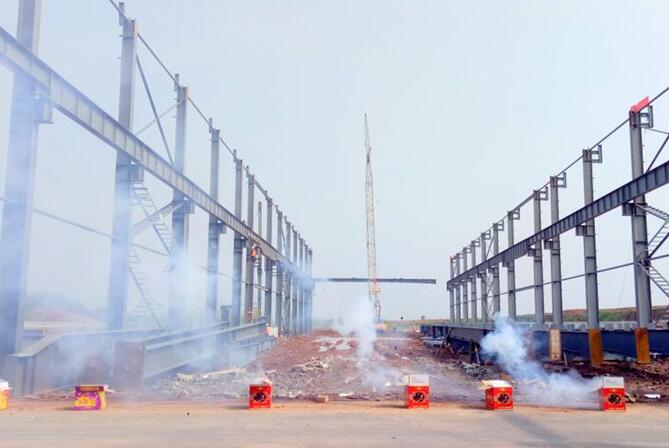 随着现场领导一声令下,鞭炮与礼花齐放,钢梁与钢架立柱平稳衔接。上梁仪式的举行标志着整个厂房钢结构安装进入了一个新的阶段。施工方表示,湖北大明一期扩建项目时间紧、任务重,在施工过程中将保证施工安全和质量,力争早日完成工程建设,保证按期交付使用。