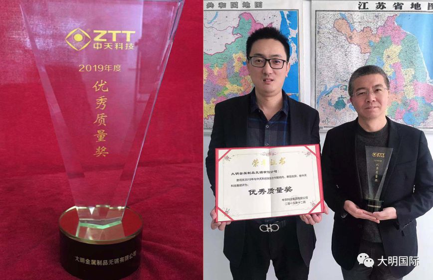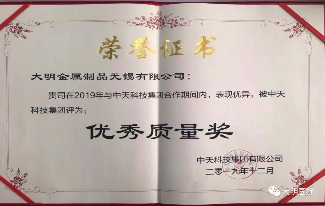 近日,大明无锡加工中心在中天科技集团举办的”2019年度全球供应商大会”中被评为”2019年度优秀质量奖”,这是继2018年获得此殊荣后的又一次载誉。此次获奖充分体现了中天集团对大明的肯定,也彰显了大明的实力。