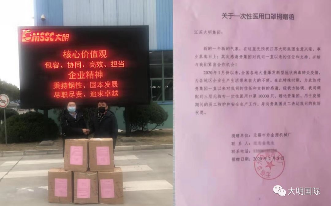 今年1月份以来爆发的新型冠状病毒肺炎疫情给全国人民的生活和工作带来很大的影响,困难当前,非常时期,产业链合作伙伴纷纷表达了共抗疫情的决心,并以实际行动向大明伸出了援手,捐赠了口罩、消毒用品等。