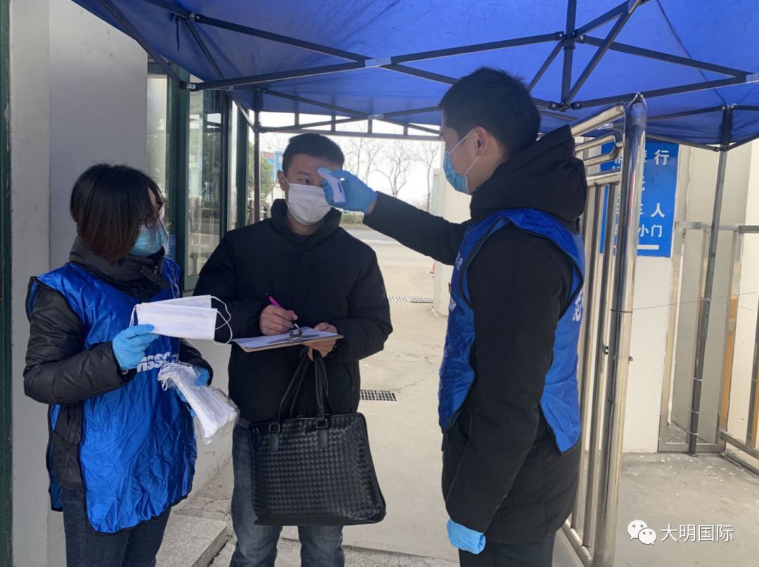 2月4日以来,在经过体温检测、基本工作要求及自身防疫培训后,党员志愿者分5批正式“上岗”,协助安保进行门禁管理。在志愿服务中,党员同志积极发现问题,提出建议,每日汇总提报给大明集团疫情防控领导小组,为公司复工准备,整改防疫措施提供有效资料。