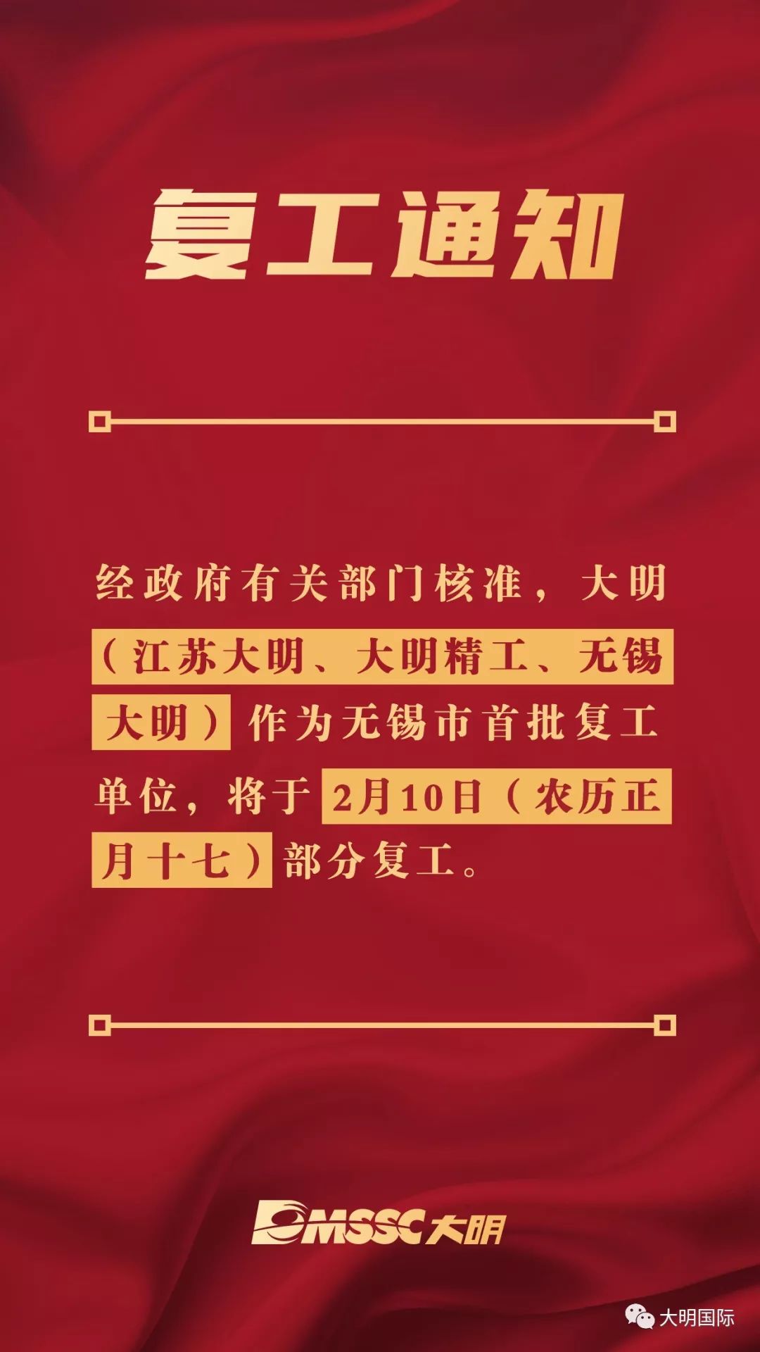 列入无锡市首批复工单位,大明将于2月10日部分复工