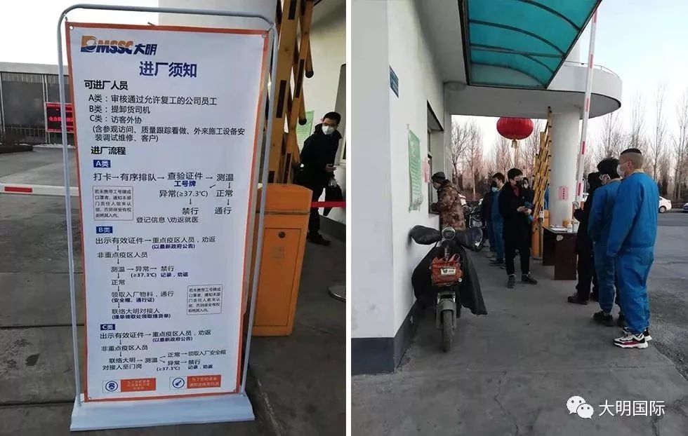 复工前,大明发布了相关政策解读、《入厂指南》、《倡议书》、《致员工信》等,详细指导员工落实防疫要求;大明还设置了严格的入厂检测流程,进行了细致的生产保障安排和办公、交通、就餐等的规范安排,全方位保障企业经营的正常开展。