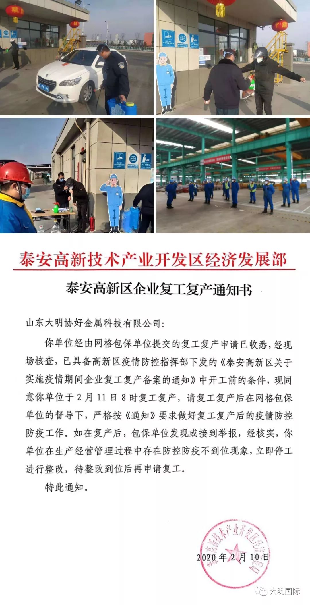 在复工准备过程中,大明得到了各级地方政府的大力支持,相关部门及领导深入调研、帮扶指导、现场核查,帮助企业完善了疫情防控体系和管理制度,为顺利复工打下了基础。复工后的大明将以更加努力的工作回报政府和各界的支持与关爱。