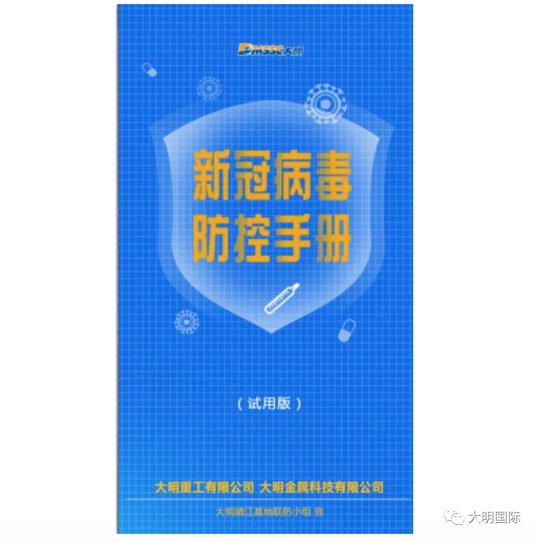 1月底,大明靖江基地紧急起草《新冠肺炎疫情防控应急预案》,成立以大明重工总经理王健为组长、靖江加工中心总经理陈宁、大明重工副总经理吴兴生为副组长的防控联动小组,组建了疫情防控党员和干部志愿工作队,发布大明靖江基地试用版《新冠病毒 防控手册》,(链接:https://flbook.com.cn/c/cQBtYaKmpw#page/10)为江阴-靖江工业园区企业的疫情防控工作做出了表率。