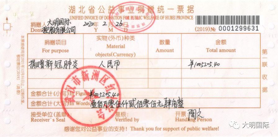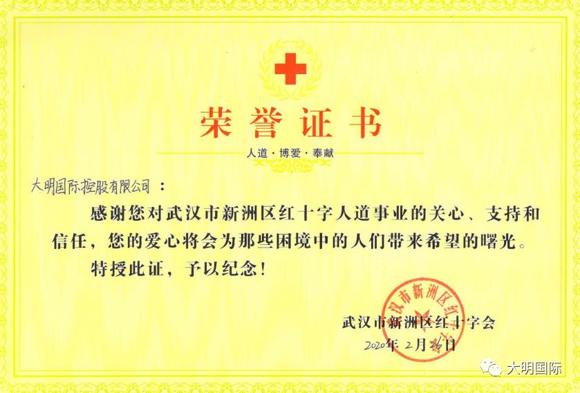 2月26日,凝聚着大明国际5000多名干部员工涓涓爱心的1005205.40元款项打到了武汉市新洲区红十字会的账户上,新洲区红十字会为大明颁发了荣誉证书。