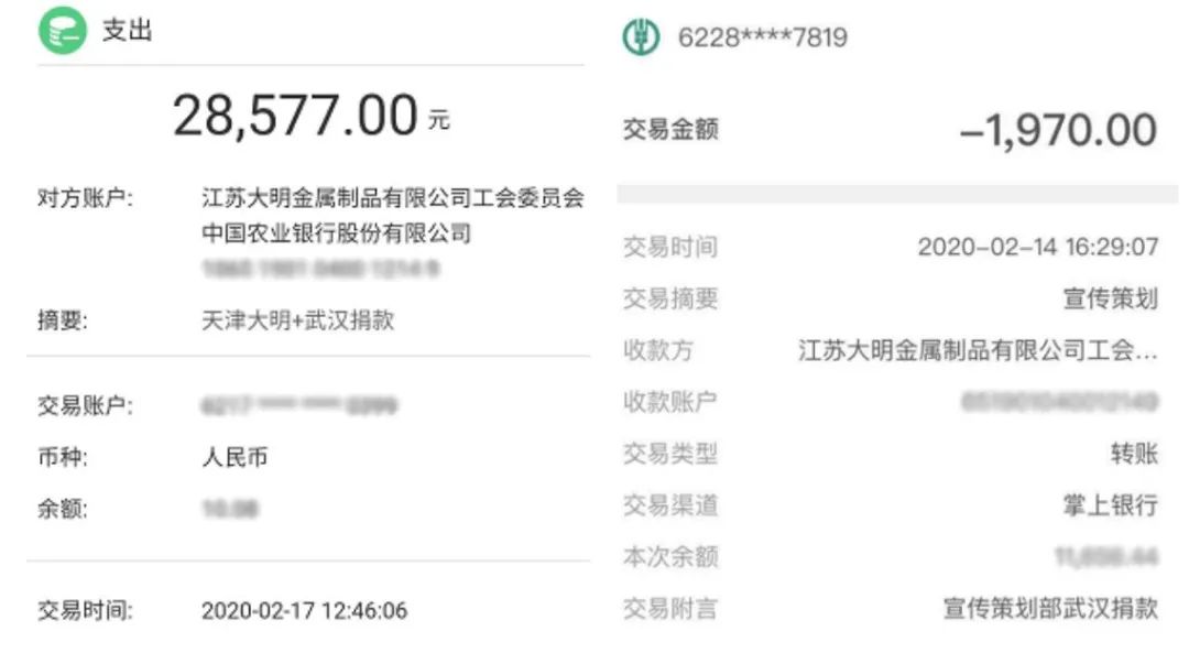 近期,新冠肺炎牵动着每个人的心,2月13日,“大明国际”微信公众号发布《“大明同心 共抗疫情” 募捐倡议书》,立刻得到各子公司和全体员工的积极响应。其中杭州加工中心营销部在微信发布一个多小时就收到部门线上捐款2410元,湖北加工中心员工虽身在疫区自己也面临诸多困难,在看到倡议书后还是踊跃在线捐款。很快,第一笔转账1970元就汇到指定的账户,捐款额在不断上升。