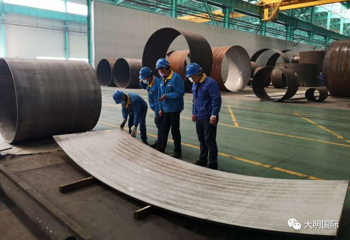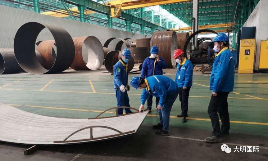 近期,大明重工承接了某造纸行业客户6台2200吨不锈钢、双相钢大罐预制项目,该项目中直径17.5m,板厚22mm的双相钢锥体板卷制是主要技术难点。项目加工前考虑到设备直径大,双相钢硬度高,不易卷制,加工风险较高。大明重工容器事业部副总经理李群和容器生产二部主管陈东进、邵建康、生产二部蔡刚等项目骨干成员第一时间组织会议讨论多种解决方案。时间紧、任务重,原计划采用先拼焊后卷制的方案经讨论后被否决。最终,通过各部门群策群力、通力合作,在试行新的单片卷制方案后,问题得到了完美解决,满足了客户要求。