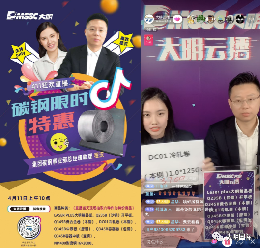 4月11日上午10点,令人瞩目的“大明云播”首秀——大明靖江加工中心碳钢线上营销在抖音平台准点燃动。集团宣传策划部Judy主播、靖江加工中心总经理助理程汉为大家准备了8款品质可靠品种齐全的碳钢产品以及各种互动好礼,可谓诚意十足。