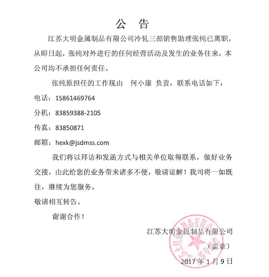 关于张纯离职公告