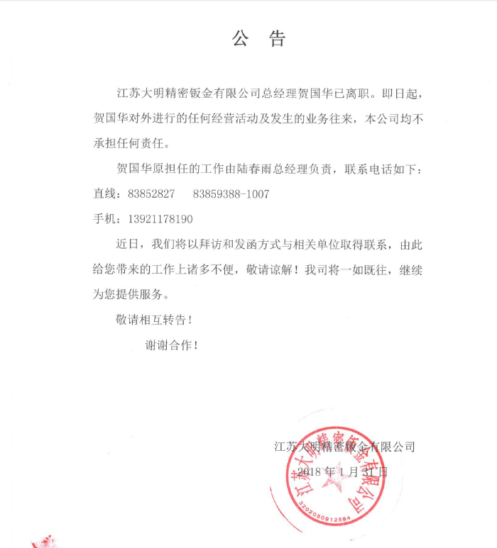 关于贺国华离职公告