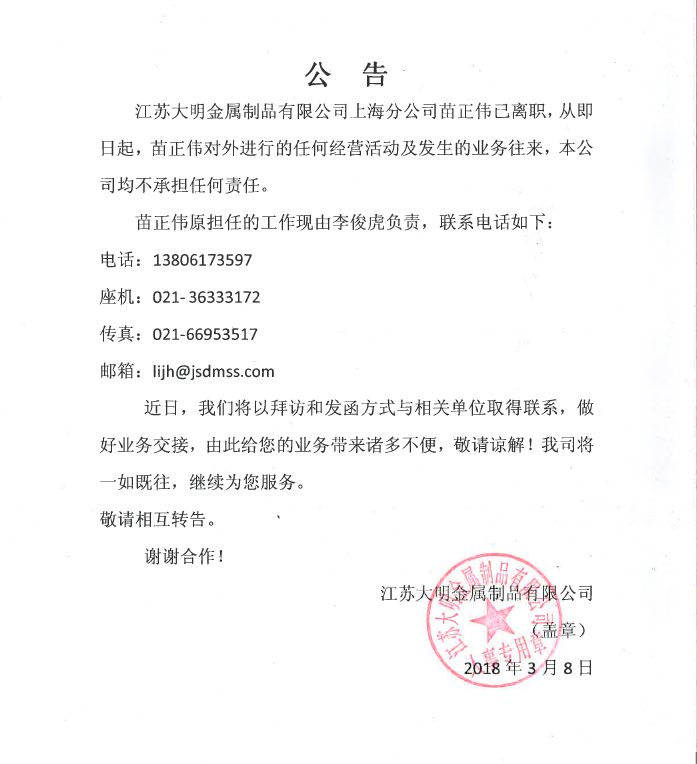关于苗正伟离职公告