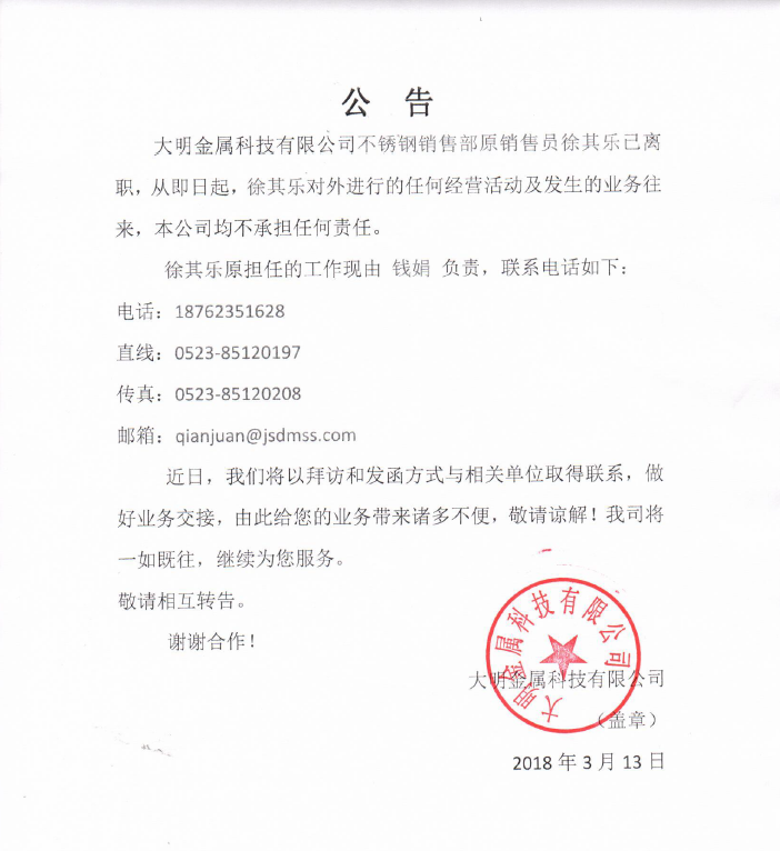 关于徐其乐离职公告