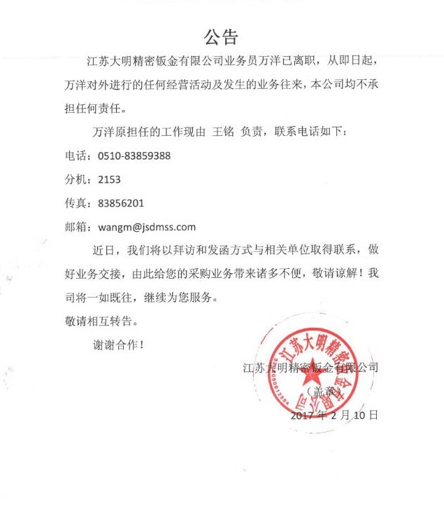 关于万洋离职公告