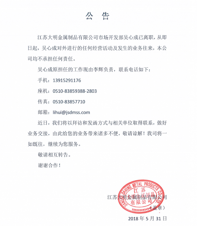 关于吴心成离职公告