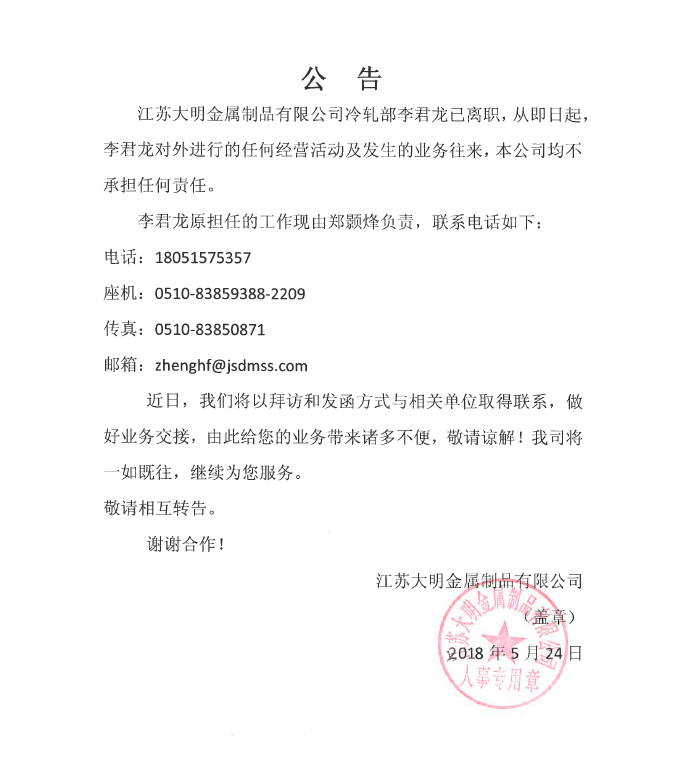 关于李君龙离职公告