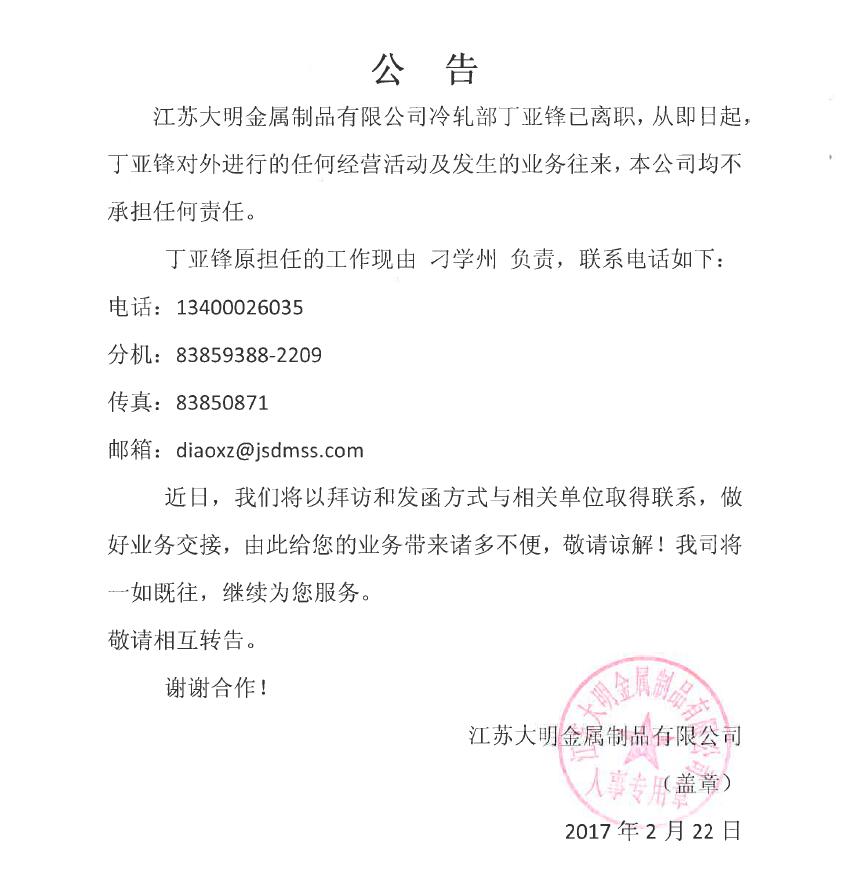 关于丁亚锋离职公告
