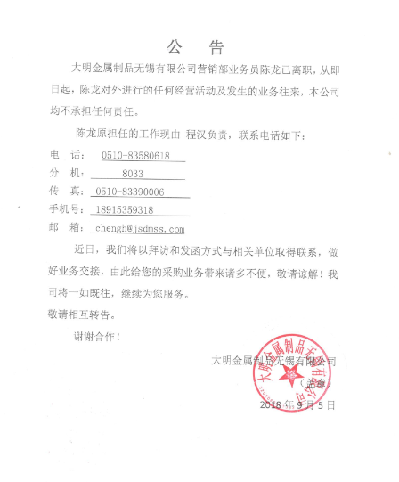 关于陈龙离职公告