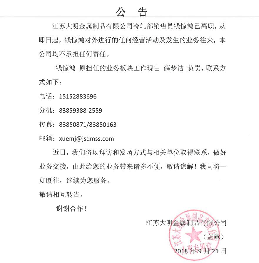 关于钱惊鸿离职公告