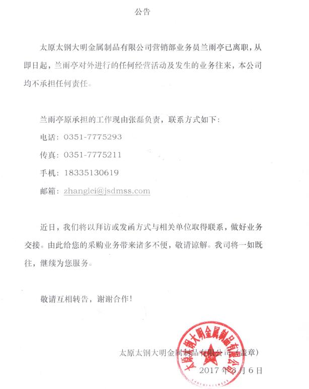 关于兰雨亭离职公告