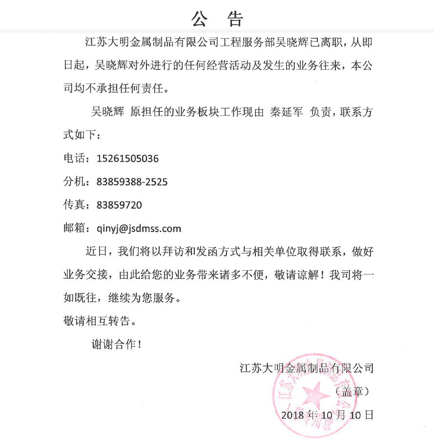 关于吴晓辉离职公告