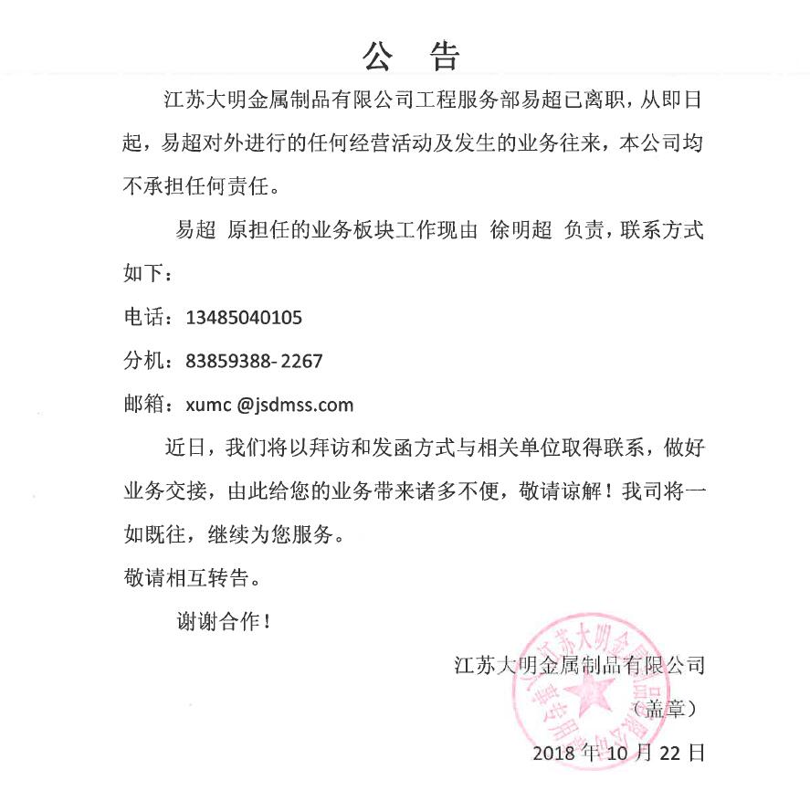 关于易超离职公告