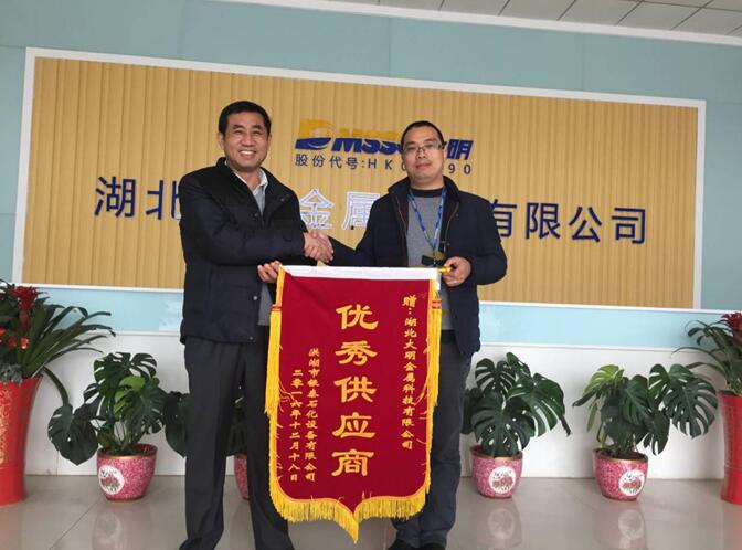 近日,湖北洪湖市银泰石化设备有限公司总经理姜涛亲自来到湖北大明,送上一面“优秀供应商”的锦旗。据悉,该客户前期在承接了中海油湖北某大型设备扩建项目后,需要寻找可靠的材料服务方,经过严谨的考察,银泰石化最终与湖北大明进行合作。目前客户已在大明采购各种材料及产品总计约200吨,涉及钢种316L、304L,以及超级奥氏体317L、8367等特殊材质。湖北大明凭借丰富的钢种资源、出色的加工能力以及快捷贴心的服务,最终获得客户的认可。
