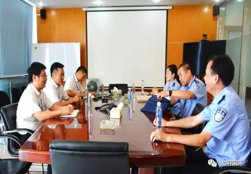 7月18日,杭州市公安局萧山分局行政审批科科长朱晓盈和社区民警一行来访杭州大明加工中心,杭州大明总经理陈钟炜、管理部部长丁军等热情接待并座谈交流。