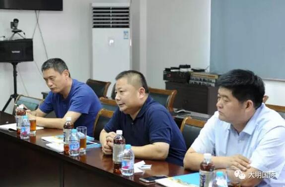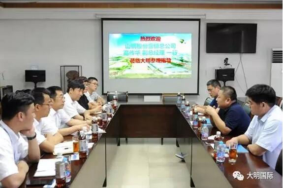 7月22日,山钢股份营销总公司副总经理高传华、板材公司经理曾凡钊和济钢无锡分公司经理赵承见一行来访大明,大明国际副总裁蒋长虹、品牌策划总监任凤华、碳钢事业部总经理陈宁、靖江大明总经理王小建等热情接待