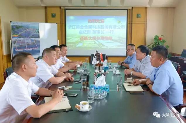7月25日,浙江甬金金属科技股份有限公司董事长虞纪群、江苏甬金科技总经理董兆勇一行来访大明,大明国际总裁周克明、副总裁蒋长虹等热情接待并座谈交流。
