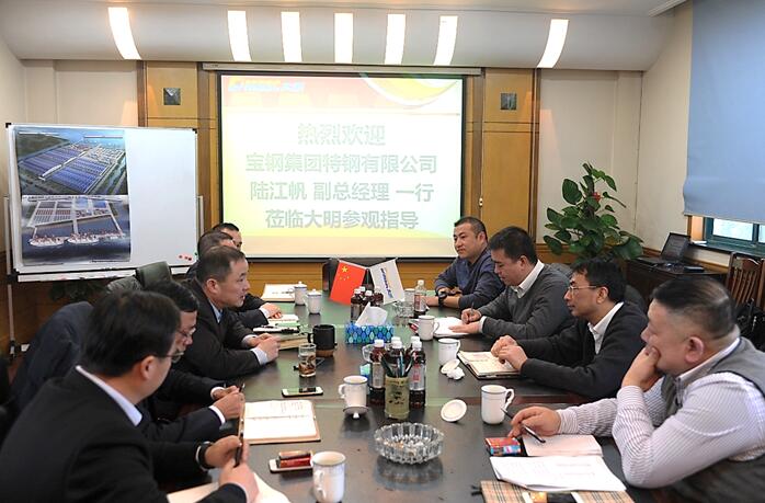 12月29日,宝钢集团特钢有限公司副总经理陆江帆一行来访大明,大明集团总裁周克明、市场营销总监张锋、江苏大明总经理福井勤、副总经理金建东、集团特钢部部长谭宏华热情接待。
