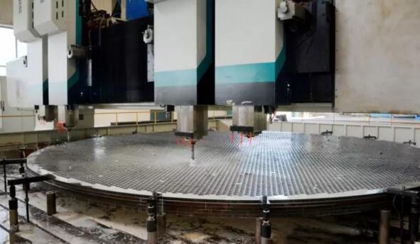 这10套7.3米的支撑板直径大,单块钻孔后五件叠加镗孔难度高,要充分考虑叠板错边、镗孔过程中需同时保证孔径、孔桥和粗糙度等指标,如果使用大型加工中心进行逐个加工的话,势必会大大延长产品的交货期。最终,大明重工生产三部进行加工方案评审,决定使用带4个钻铣头的定梁重型龙门移动钻铣床,通过钻孔加工、刚性攻丝、铰孔进行一体化配套加工,以提高加工效率。近日,从生产一线了解到,有5套支撑板正在进行钻孔加工,即将顺利发货。