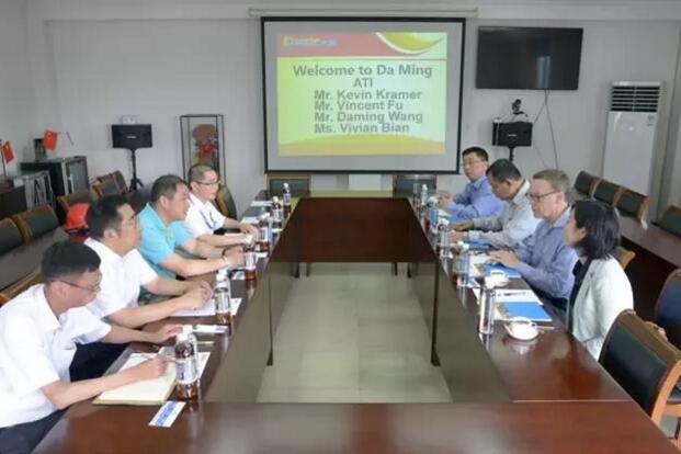 9月16日,美国ATI集团首席商务官、高级副总裁Kevin Kramer、亚洲区总裁Vincent Fu、中国区总经理王大明、销售经理卞薇薇一行来访大明,大明集团总裁周克明、副总裁蒋长虹、集团市场营销总监张锋、江苏大明总经理福井勤、大明重工总经理王健等热情接待。
