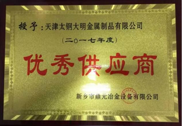 ??近日,天津太钢大明被低温行业企业新乡市鼎元冶金设备有限公司授予“年度优秀供应商”称号,以示对天津太钢大明所提供服务的认可。