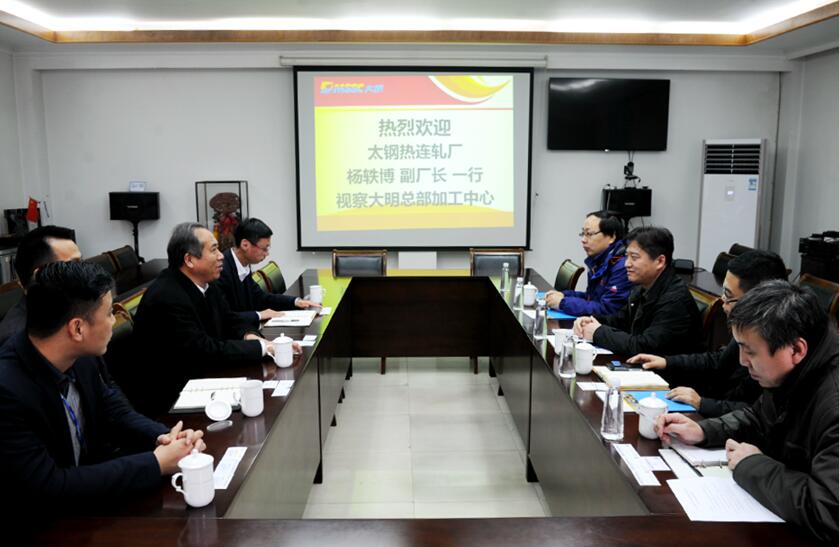 在过去的2016年,太钢热连轧厂与大明在热轧产品的合作上取得了不错的成绩,此次杨轶博副厂长携技术人员来访大明,主要为了进行技术的对接。双方就技术、销量、产能等进行了充分的交流,表示将通过特色产品和优质的加工为下游制造企业提供更好的服务。