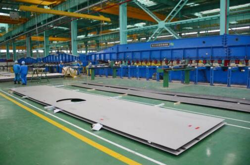据悉,“Ω”型异厚化学品船板能够更大程度降低化学品船舱壁前道及后道的焊接施工难度,提高焊接效率和质量,充分保证了仓壁成型的质量。此次49000吨全球最大双相不锈钢化学品船的槽型舱壁将采用“Ω”型异厚化学品船板,由于此次配套的化学品船板存在板幅超宽、纵缝拼接、Ω型(双Z型)焊后折弯一次成型等特点,为保证成型产品的各项精度要求,大明重工多部门协作,共同探讨化学品船船板预制加工工艺的合理性,最终预制加工指标均达到设计要求,预制加工成功后现场随即展开批量加工。