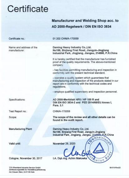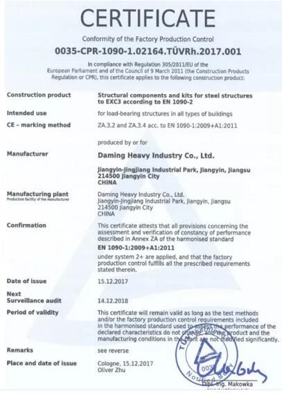 为进一步打开欧洲钢结构、压力容器市场,大明重工欧洲客户对焊接企业资质及产品的高标准要求进行了调研。2016年10月11日,TÜV主持了对大明重工焊接企业资格认证、ISO焊接工艺评定以及焊工资质考试。2017年4月15日,大明重工顺利拿到了EN1090焊工证及ISO3834焊接工艺评定证书。