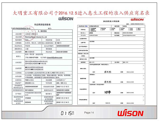 2016年12月5日,大明重工通过了惠生工程技术服务有限公司(简称"惠生工程")的最后审查,顺利进入惠生工程准入供应商名录。近日,大明重工收到准入认可正式文件。