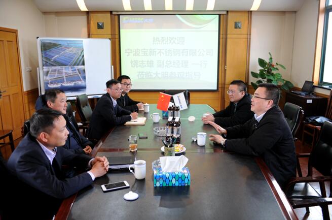 2月9日,宁波宝新不锈钢有限公司副总经理饶志雄、冷轧销售副总经理洪流来访大明,大明集团总裁周克明、市场营销总监张锋、市场营销总监助理倪晨热情接待。