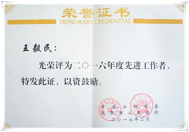 2月4日上午,江阴市召开2016年度全市先进表彰大会,大明重工技术部部长王毅民荣获江阴市“2016年度先进工作者”称号。