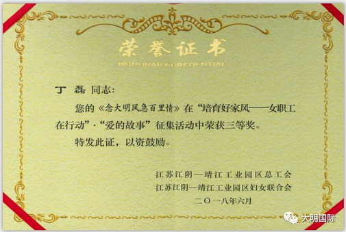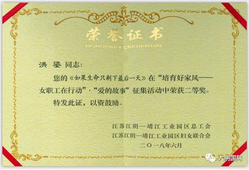 近日,在由江阴市总工会开展的“培育好家风—江阴女职工在行动”系列主题实践活动“爱的故事”有奖征文比赛中,大明重工总经办洪鎏的参赛作品《假如生命只剩下最后一天》获二等奖、技术部丁磊的文章《念大明风急百里情》获三等奖。同时,大明重工技术部周磊、大明重工质保部陈金花还获得优秀奖。
