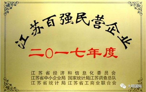 6月27日,江苏2017年度百家民营企业榜单公布,其中江苏大明金属制品有限公司继去年入围榜单后再次入选,排名列第37位,比2016年度上升了60多位。