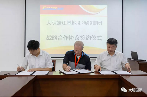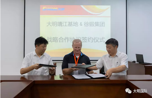 2018年8月6日,徐锻集团、大明重工、大明靖江加工中心顺利签订三方战略合作框架协议,徐州锻压厂集团有限公司总经理Jon•C•Martin、总经理助理黄浩、采购总监蒋文娟、采购经理王垒,以及大明重工总经理王健、靖江加工中心总经理王小建、大明重工副总经理罗智辉、靖江加工中心副总经理赵建明等出席签约仪式。