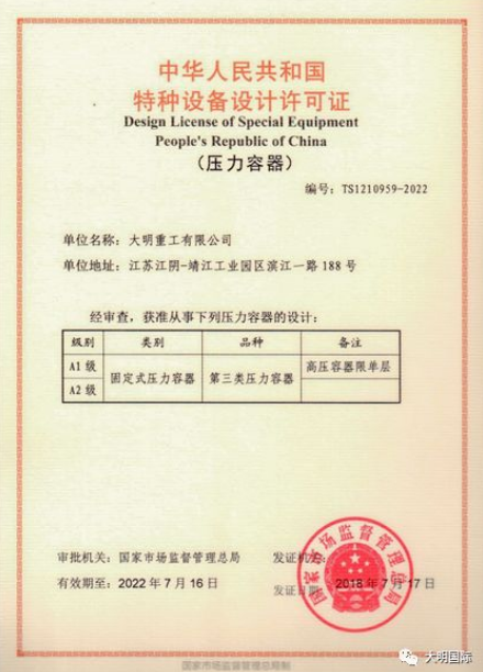 2018年8月8日,大明重工顺利取得国家压力容器A1、A2设计许可证。A1、A2类压力容器设计许可证的顺利取得,将大大提升大明重工的设计资质,是大明压力容器事业发展道路上的又一里程碑。