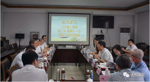 8月20日,江苏富仁集团董事长袁仁伟、富仁重工总经理吴朝阳、万和自动总经理周云燕、润伟物流总经理袁倩云、徐锻公司总经理Jon Christopher Martin、生产执行总监钱栋一行来访大明,大明国际董事会主席周克明、总裁蒋长虹、副总裁路平、集团市场开发部总经理福井勤、碳钢事业部总经理陈宁、靖江加工中心总经理王小建热情接待。