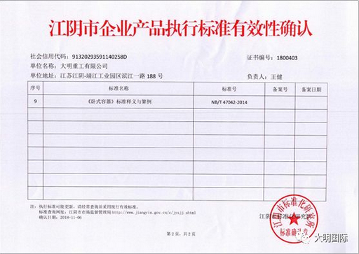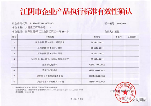 11月06日,江阴市市场监督管理局调研大明重工,开展指导企业进行执行标准自我声明及有效性确认的工作。江阴市市场监督管理局调研负责人介绍,此次走访是为了深入贯彻《中华人民共和国标准化法》(2018年1月1日修订实施)等法律法规和规章的要求,确保企业的行为符合法律的相关要求,规避企业和单位使用作废标准带来的各类风险,从而保障质量体系有效运作。最终,大明重工技术标准经江阴市市场监督管理局专业技术人员现场确认查新之后进行了网上公示,并开具了江阴市企业执行标准有效性确认证书。